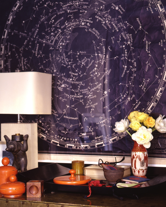 Another map that has captured this quality of mystery is called ‘Star Chart for Northern Skies.’ Published by Rand McNally in 1915, it is a sky map of the northern hemisphere, one that interior designer Thomas O’Brien referenced in the magazine Elle Décor and later discussed in one of his books. It is a real map intended for reference and maybe to decorate classroom walls. It is one of the maps that have a simple style that nevertheless gives that sense of wonder. Although having a star map in an astronomy magazine is great, Elle Décor magazine reaches a much wider audience of people who would never have given this subject a single thought. This minimalist style of star map art is what I wanted for my own map.