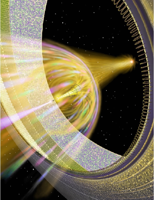 Image: An artist’s conception of the Benford/Niven ‘shipstar’ concept. Think of the ‘bowl’ as half of a Dyson sphere curved around a star whose energies flow into a propulsive plasma jet that moves the entire structure on its journey. Here the notion of living space may remind you of Niven’s Ringworld, that vast structure completely encircling a star, though not enclosing it. The difference is that in the ShipStar scenario, most of the ‘bowl’ is made up of mirrors, with living space just on the rim. Credit: Don Davis.